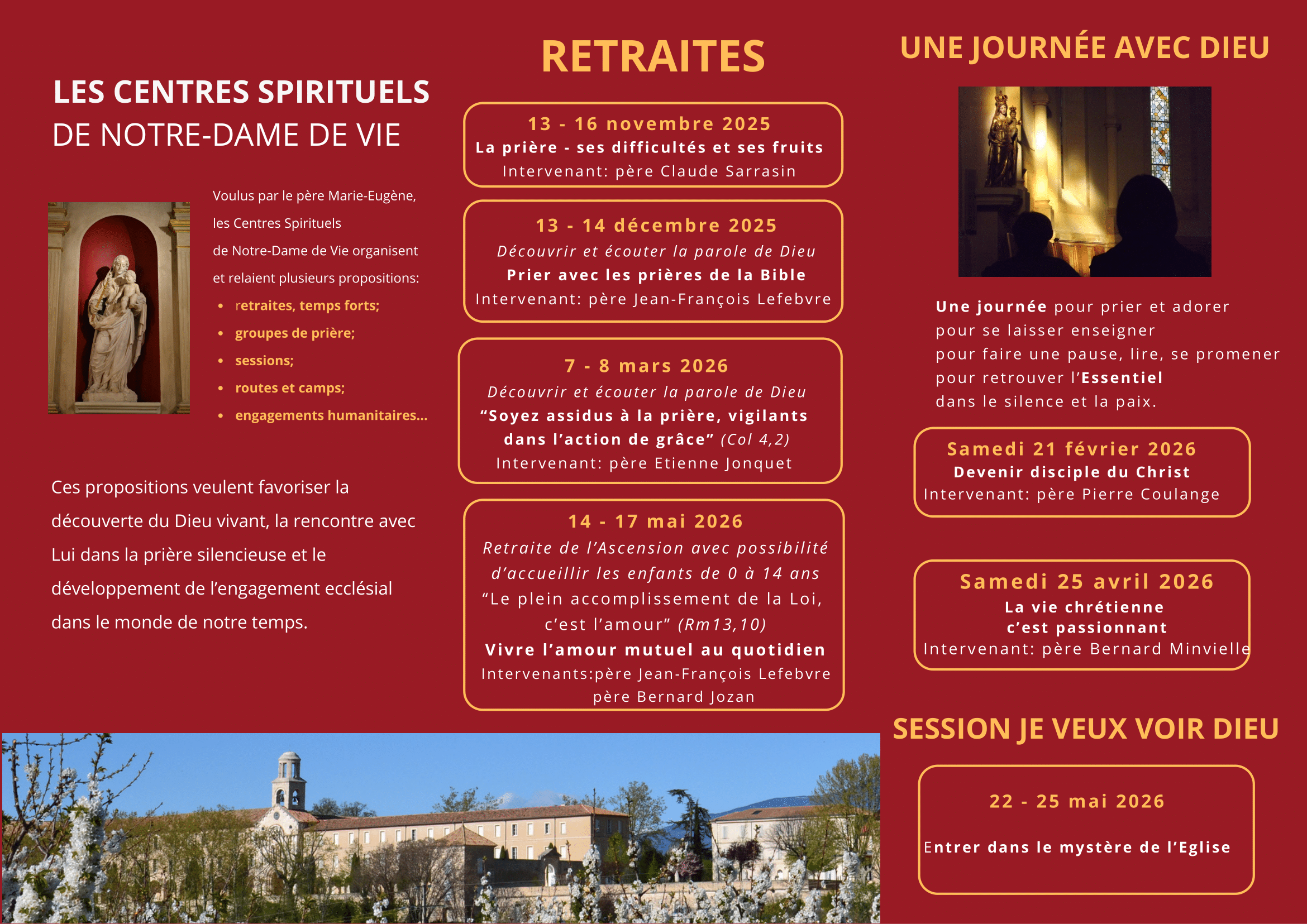 Ces activités animées par le Centre Spirituel de Notre-Dame de Vie veulent offrir à chacun un cadre vivant pour bénéficier d’un enseignement pratique sur la prière et le témoignage, pour unir contemplation et agir chrétien dans la vie quotidienne.