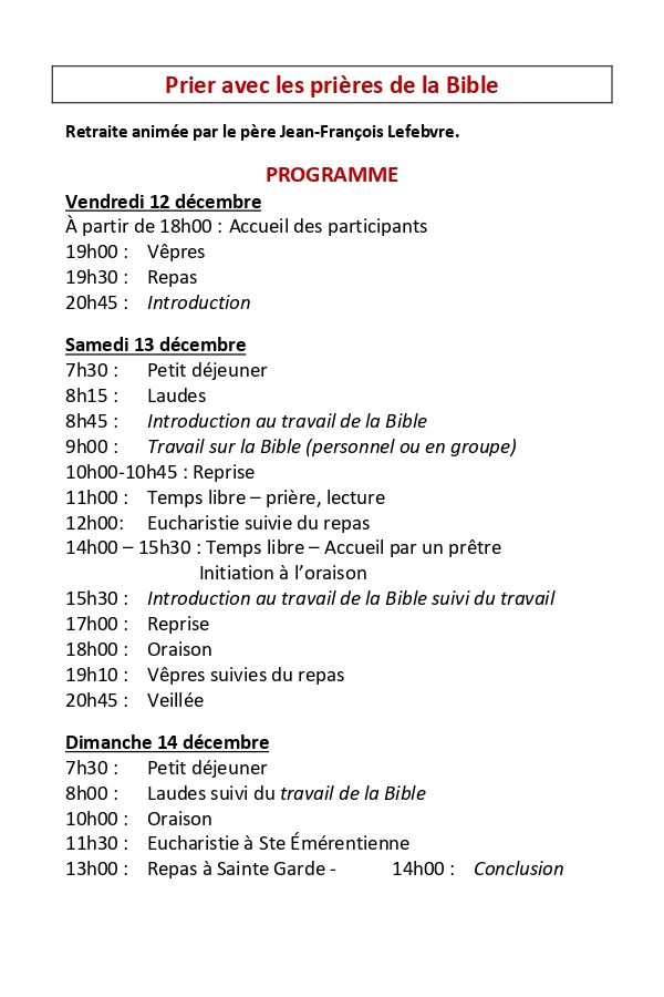 Les récits bibliques sont souvent interrompus par des prières qui donnent le sens de ce qui est en train de se vivre en exprimant la foi des fidèles. Au cours de cette session, une étude en commun de quelques-unes de ces prières sera proposée, dans un climat favorisant l’oraison.